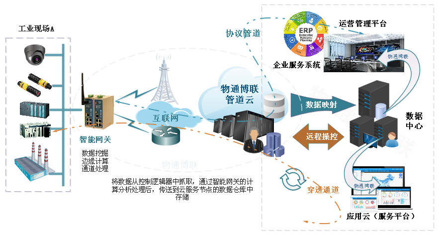 系統以重型工業機械裝備遠程維護遠程運維云平臺+智能網關為基礎的遠程綜合管理系統,智能網關是整個系統的數據采集端。它與設備端相連自動采集所控設備的運行狀態及相關數據(如地理位置信息,相關的溫度、壓力、流量等),并通過物通博聯穿透云安全管道將信息發送到重型工業機械裝備遠程維護遠程運維云平臺;,同時接受重型工業機械裝備遠程維護遠程運維云平臺;的指令認證后運行相關操作。