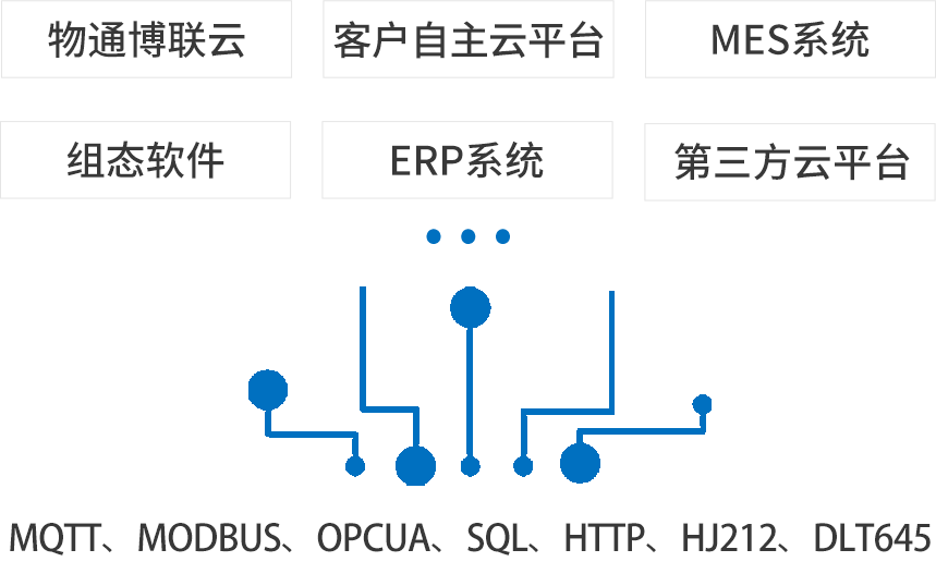 北向支持接入物通博聯云平臺,客戶自主開發的云平臺,第三方云平臺(根云、美云、華為、阿里、百度、微軟等IOT云平臺),組態軟件、MES系統、行業監控平臺等工業軟件