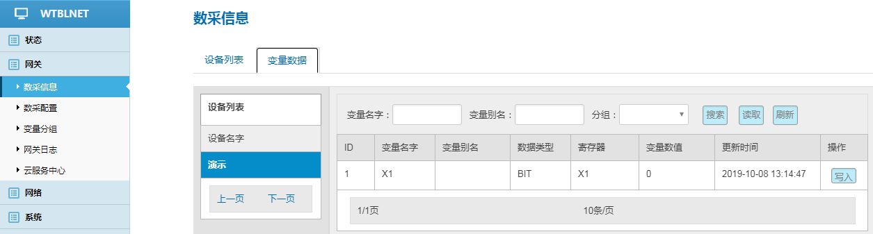 數采配置(設備信息+變量參數)完成后,重啟采集程序并生效配置,即可在:數采信息---變量數據---設備名稱 中看到采集上來的數據。
