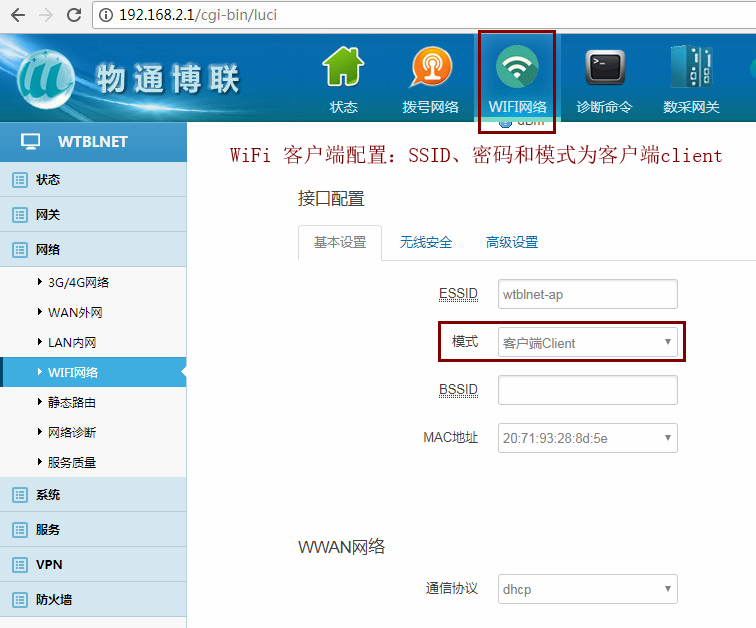 模式:客戶端Client(通過(guò)WiFi上外網(wǎng)請(qǐng)選擇client模式,如果是共享WiFi給其他設(shè)備請(qǐng)選擇AP模式)