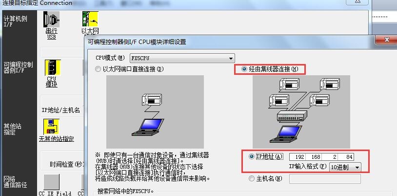2、“CPU模式”設(shè)置,“經(jīng)由集線器連接”,填寫(xiě)控制器的IP地址。