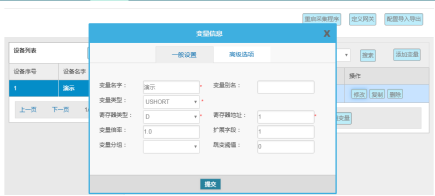 變量配置主要是定義變量名(自定義內容,不可使用中文命名)、變量別名(自定義,可使用中文名字)、寄存器類型和寄存器偏移地址,并定義一些數據規則(如:倍率、小數點、單位、告警)。