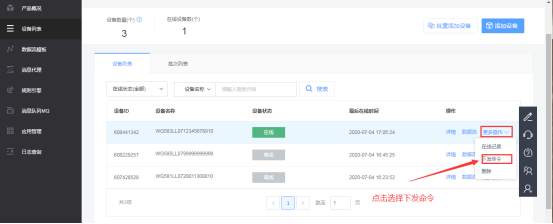 可以在設(shè)備列表中選擇對(duì)應(yīng)網(wǎng)關(guān)更多操作中的下發(fā)命令
