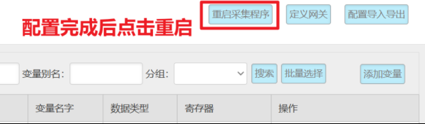 變量配置主要是定義變量名(自定義內容,不可使用中文命名)、變量別名(自定義,可使用中文名字)、寄存器類型和寄存器偏移地址,并定義一些數據規則(如:倍率、小數點、單位、告警)。