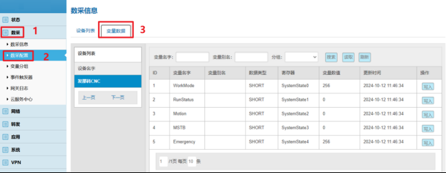 數采配置(設備信息+變量參數)完成后,重啟采集程序并生效配置即可在:數采信息---變量數據---設備名稱 中看到采集上來的數據。