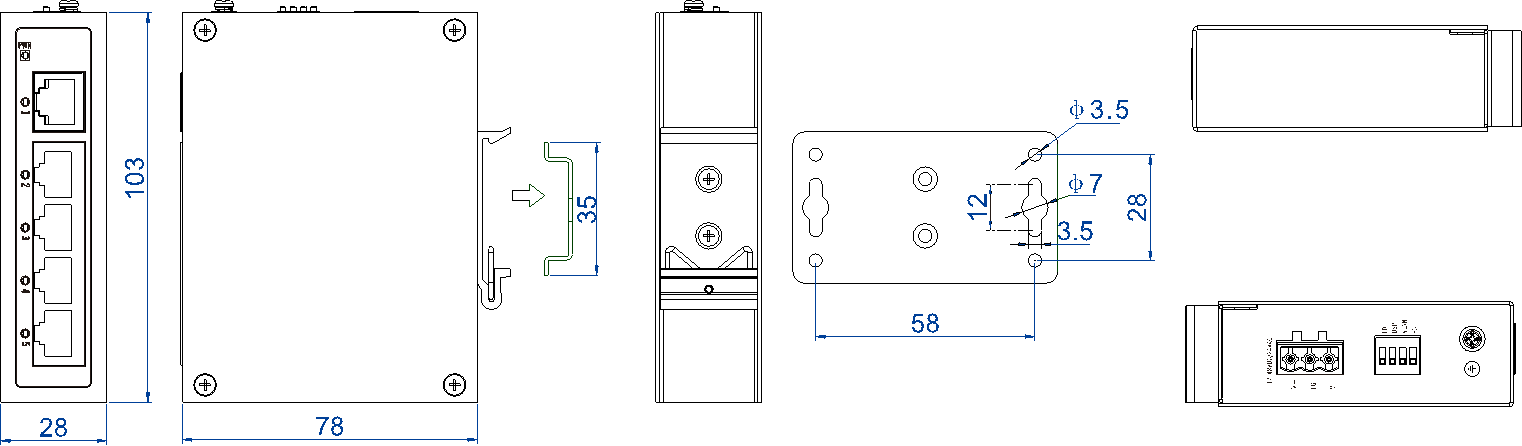 外殼:IP40防護等級,金屬外殼 安裝:DIN導軌式或壁掛式安裝 尺寸(寬×高×深):28mm×103mm×78mm |