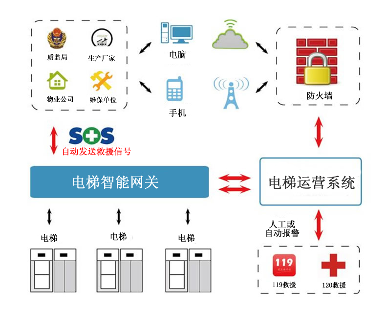以物通博聯工業智能網關為核心,通過串行/網口通信獲取電梯控制器數據并進行本地計算分析后,把這些數據通過工業智能網關有線或無線網絡安全可靠地傳輸到后臺服務器,物通博聯工業智能網關還具有短信發送和接收功能,可將電梯故障信息發送到維保人員、物業公司人員、應急處置服務平臺人員的手機上,出現緊急情況,實現第一時間報警。電梯運行安全物聯監控平臺,通過調取后臺服務器的數據,起到了統一管理、統一指揮、統一調度的功能。
