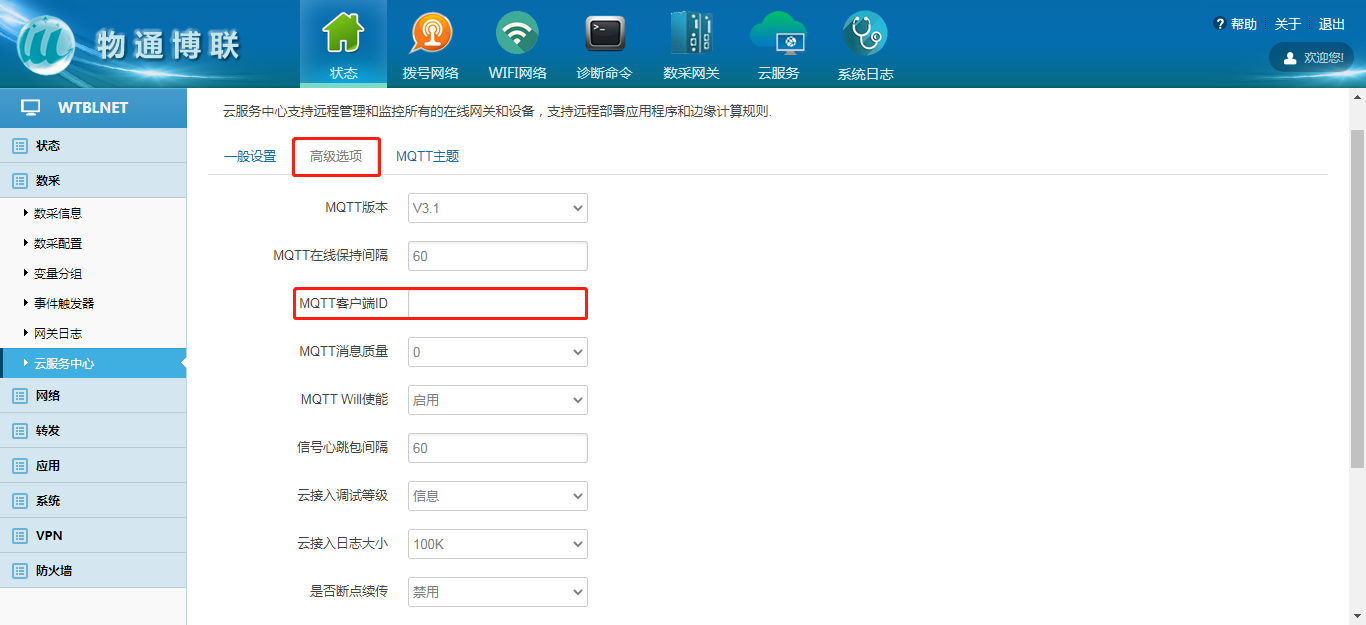 在高級選項中配置MQTT客戶端ID連接參數,填寫完畢后保存并應用;