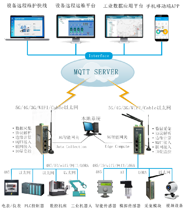 物通博聯工業RS485串口網關內置豐富的工控協議,支持各種PLC、儀器儀表、CNC機床、環保設備、電力設備、非標設備等,支持Modbus RTU 協議、Modbus TCP 協議、 OPC UA、 MQTT 協議,DLT645、IEC104等等,方便用戶快速把多種工業設備接入物聯網云平臺如:物通博聯云,百度云、根云、華為云、AWS IoT、阿里云等云平臺,同時也可以接入SCADA、MES、BAS、ERP 等上位機數據處理系統,數據可以同步傳輸給云平臺和上位機系統。