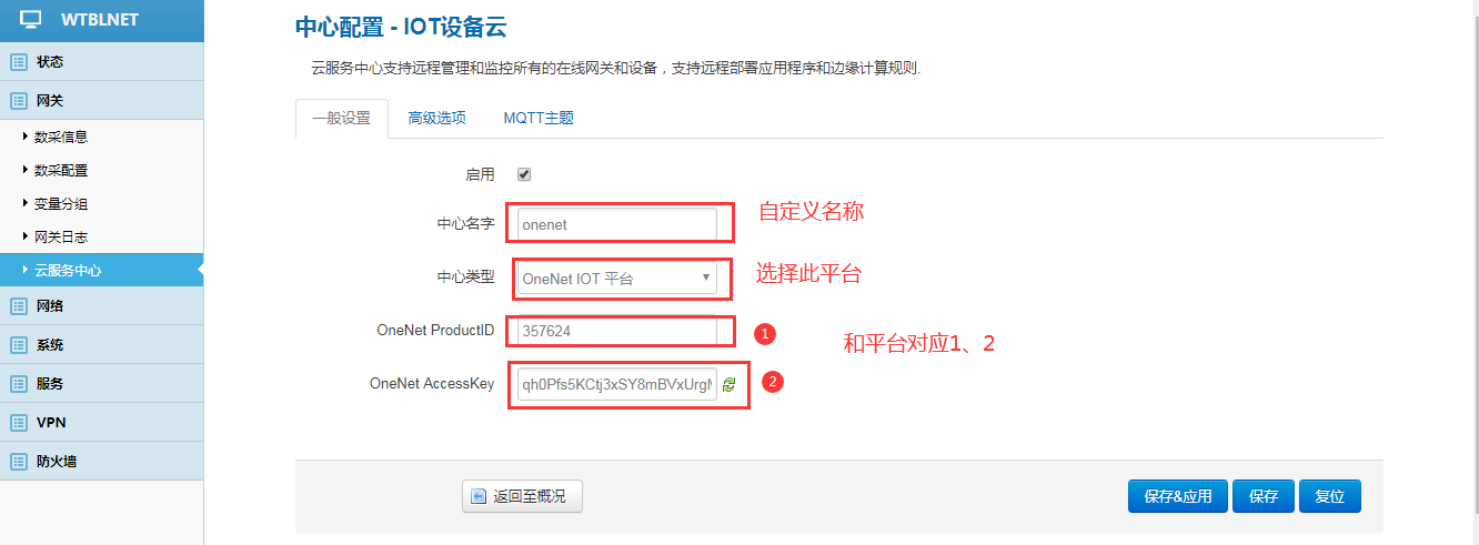 3、在網關配置“云服務地址”添加onenet平臺(物通博聯