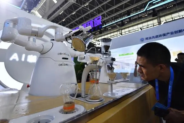 9月6日,參觀者在數博會上觀看AI咖啡手沖機器人制作咖啡。 新華社記者 駱學峰 攝