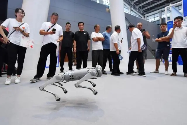9月8日,參觀者在數博會上觀看四足機器人表演。 新華社記者 駱學峰 攝