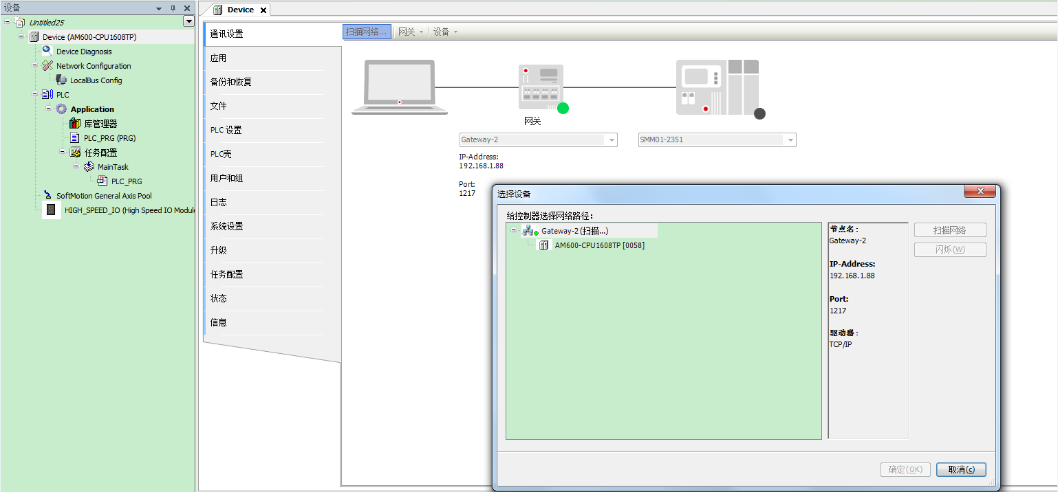 2、點擊“Device”,進入通訊設置界面--點擊“網關”--選擇“添加網關”-進入網關設置界面,將PLC的IP設置成網關IP。(網關名稱自定義)