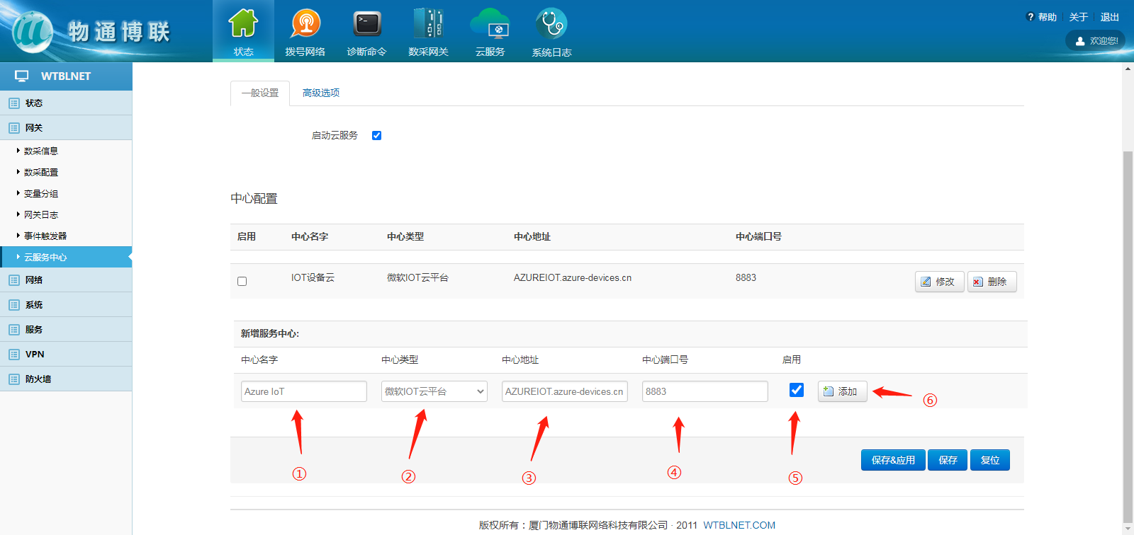 3、打開物通博聯(lián)網(wǎng)關(guān)WEB界面,新建一個(gè)連接中心,中心類型選擇微軟IoT云平臺(tái),輸入相應(yīng)信息,勾選啟用,點(diǎn)擊“添加” ,填寫對(duì)應(yīng)數(shù)據(jù)即可實(shí)現(xiàn)設(shè)備數(shù)據(jù)上傳到微軟Azure IoT物聯(lián)網(wǎng)平臺(tái)。