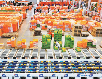 12月16日,在江西省贛州市安遠縣產城新區的一家采用5G+工業互聯網技術的果業加工企業內,工人在智能化生產線上加工包裝贛南臍橙。朱海鵬攝(人民視覺)