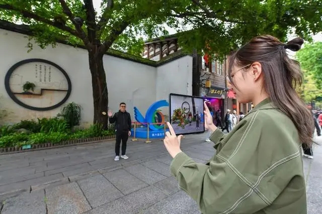 在三坊七巷,工作人員持平板電腦體驗(yàn)元宇宙街區(qū)效果。(圖源:福州日?qǐng)?bào))