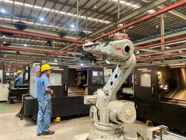 近日,在銀華機(jī)械“5G智慧工廠”,工人正操作機(jī)械臂開展相關(guān)作業(yè)。