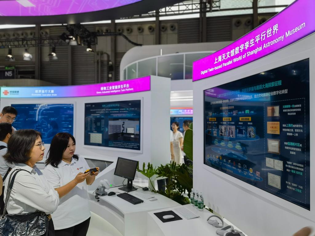 6月26日,觀眾在中國聯(lián)通展臺(tái)體驗(yàn)“上海天文館數(shù)字孿生平行世界”。新華社記者 陳愛平 攝