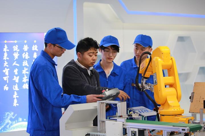 銅陵職業技術學院工業機器人技術專業學生在教師的指導下學習工業機器人操作技能。(潘偉 攝)