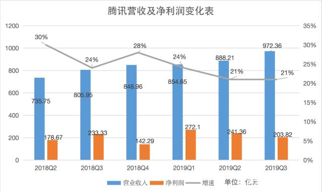 騰訊財報顯示,2019年第三季度營收972億元,同比增長20.6%,低于市場預期的990.4億元,增速與上季度持平;第三季度,公司股東應占利潤,即凈利潤203億元,同比下降13%,低于市場預期的235.3億元。