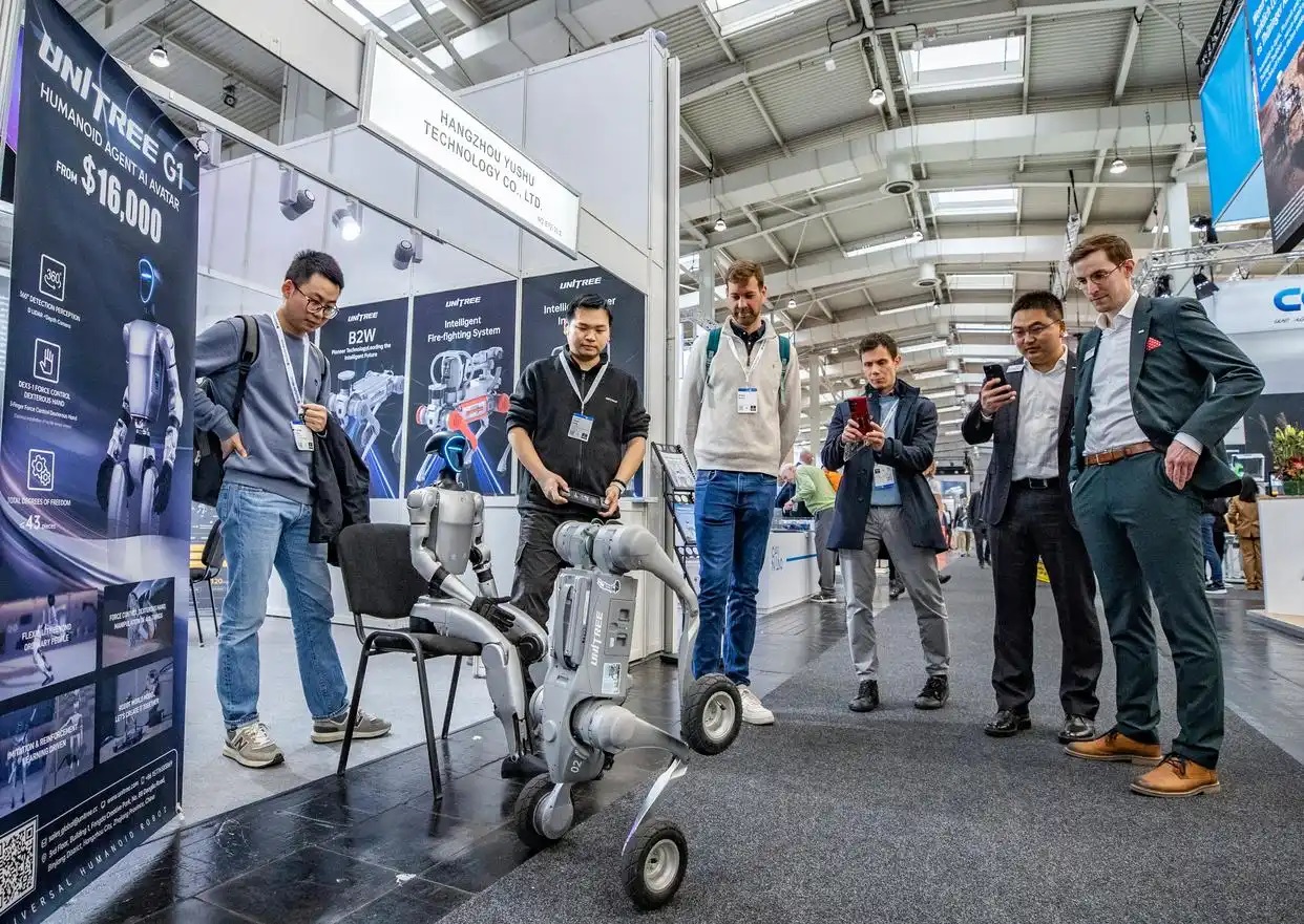 德國漢諾威工業(yè)博覽會(huì)展館內(nèi),人潮涌動(dòng),一只四足機(jī)器狗疾馳而過,流線型金屬機(jī)身靈活擺動(dòng)。它精準(zhǔn)避開人群,偶爾停下,微微擺動(dòng)腦袋,仿佛在觀察周圍環(huán)境。身后,觀眾紛紛小跑追趕,舉著手機(jī)拍攝記錄。這只機(jī)器狗最終停在一家中國企業(yè)展臺(tái)前,展臺(tái)旁還坐著一個(gè)人形機(jī)器人,科技感撲面而來。