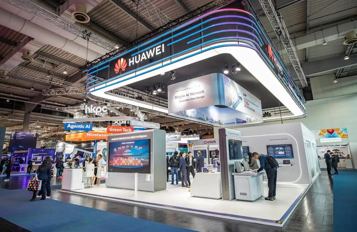 2025年4月1日,在德國漢諾威工業(yè)博覽會(huì)上,人們參觀華為展區(qū)。新華社記者張帆攝 華為展區(qū)的一處區(qū)域,巨型屏幕閃爍跳躍,數(shù)據(jù)流與動(dòng)態(tài)圖像交錯(cuò)呈現(xiàn),數(shù)臺(tái)大機(jī)械臂繁忙運(yùn)作,整個(gè)場(chǎng)景宛若一座新型工廠。