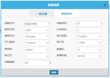 輸入設備名稱(任意),設備序號(任意,注意同一網關下的設備序號不能重復),從站地址(設備站號),通信協議(KeQiang,根據注塑機型號選擇),接口類型(232串口),串口號(連接網關端串口號),以及串口參數(一般注塑機默認波特率是38400,數據位8,無校驗,停止位1),采集周期根據自身需求設置,然后點擊保存。