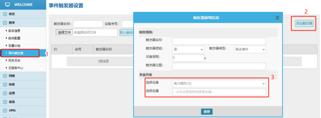 設(shè)置觸發(fā)器規(guī)則,選擇相應(yīng)的設(shè)備以及設(shè)備對應(yīng)的變量數(shù)據(jù)。