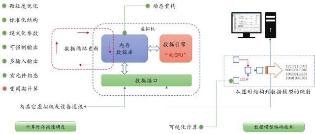 因此,需要一種數(shù)據(jù)庫的計(jì)算機(jī)制。這個(gè)功能由圖3中的數(shù)據(jù)引擎模塊完成。內(nèi)存數(shù)據(jù)庫中包含靜態(tài)與動(dòng)態(tài)兩種數(shù)據(jù),數(shù)據(jù)引擎利用其中的靜態(tài)數(shù)據(jù)做驅(qū)動(dòng),完成其動(dòng)態(tài)數(shù)據(jù)的更新。為了讓工業(yè)互聯(lián)網(wǎng)的平臺(tái)能夠滿足工程技術(shù)人員開發(fā)相關(guān)應(yīng)用和未來社區(qū)生態(tài)的建設(shè)與發(fā)展的要求,我們引入了圖計(jì)算技術(shù)。應(yīng)用開發(fā)人員可以利用圖計(jì)算工具來構(gòu)建相關(guān)算法的圖結(jié)構(gòu)。這種結(jié)構(gòu)具有相對比較直觀的邏輯關(guān)系,它還能夠通過自動(dòng)編譯技術(shù),將圖形結(jié)構(gòu)映射為特定的數(shù)據(jù)模型,從而實(shí)現(xiàn)工業(yè)互聯(lián)網(wǎng)應(yīng)用的無代碼開發(fā)模式。借助這種圖形結(jié)構(gòu)與數(shù)據(jù)模型的映射關(guān)系,我們還可以輕松實(shí)現(xiàn)工業(yè)互聯(lián)網(wǎng)應(yīng)用計(jì)算的可視化和可動(dòng)態(tài)重構(gòu)的功能。