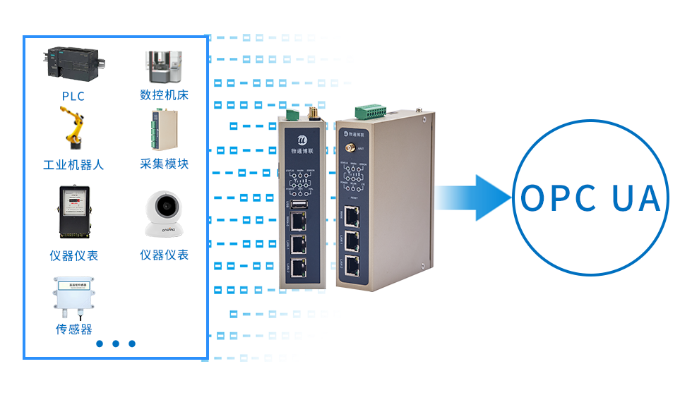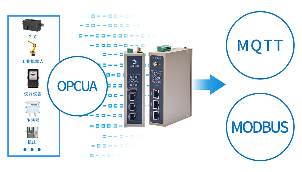 物通博聯(lián)OPC網(wǎng)關(guān)具有設(shè)備聯(lián)網(wǎng)、數(shù)據(jù)采集、協(xié)議解析、邊緣計(jì)算、云端接入等功能,支持OPC UA協(xié)議解析數(shù)據(jù)采集,能夠連接到PLC、儀器儀表、傳感器、數(shù)控機(jī)床、DCS、SCADA等,實(shí)時(shí)采集數(shù)據(jù)并通過Modbus/MQTT協(xié)議傳輸?shù)皆破脚_(tái)或本地上位機(jī),支持采集設(shè)備數(shù)據(jù)通過OPC UA協(xié)議轉(zhuǎn)發(fā)給組態(tài)軟件、上位機(jī)軟件、云平臺(tái),實(shí)現(xiàn)設(shè)備遠(yuǎn)程監(jiān)控、遠(yuǎn)程管理。
