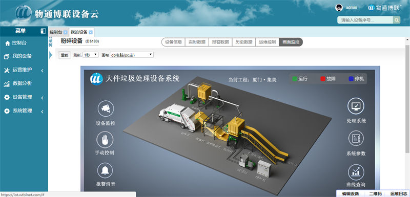 物通博聯(lián)處理垃圾設(shè)備物聯(lián)網(wǎng)為垃圾處理設(shè)備廠家實現(xiàn)全球設(shè)備統(tǒng)籌,打造一個安全監(jiān)控、設(shè)備遠程維護和管理、設(shè)備遠程調(diào)試、配件管理、故障告警為一體的垃圾處理設(shè)備綜合服務(wù)平臺,實現(xiàn)從“生產(chǎn)型制造”向“服務(wù)型制造”的轉(zhuǎn)型,提升生產(chǎn)效率、產(chǎn)品質(zhì)量和技術(shù)支持水平。