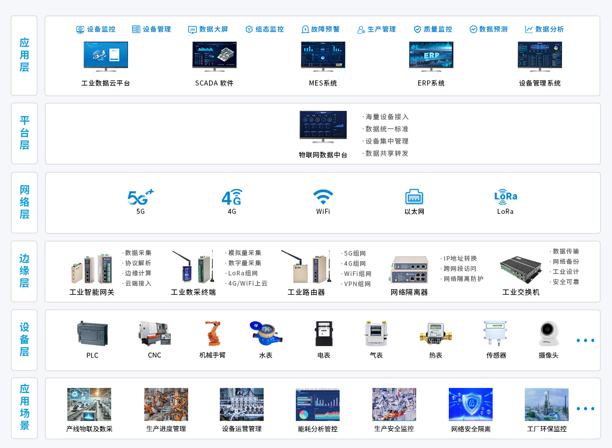 物通博聯聚焦工廠數字化轉型,構建 “邊緣接入 - 數據處理 - 應用落地” 技術體系:以工業智能網關、數采終端等邊緣硬件,接入工廠生產設備、能耗設備、安防監控設備,解析異構協議并做邊緣預處理。再將標準化數據上傳至物聯云平臺與 MES 系統,同時依托 IOT 數據中臺實現數據資產化管理,支撐設備監控、能耗分析、生產可視化等應用。最終打通 “設備 - 數據 - 業務” 鏈路,助力工廠完成生產運營數字化升級,為柔性生產、預測性維護等新業務提供技術底座。