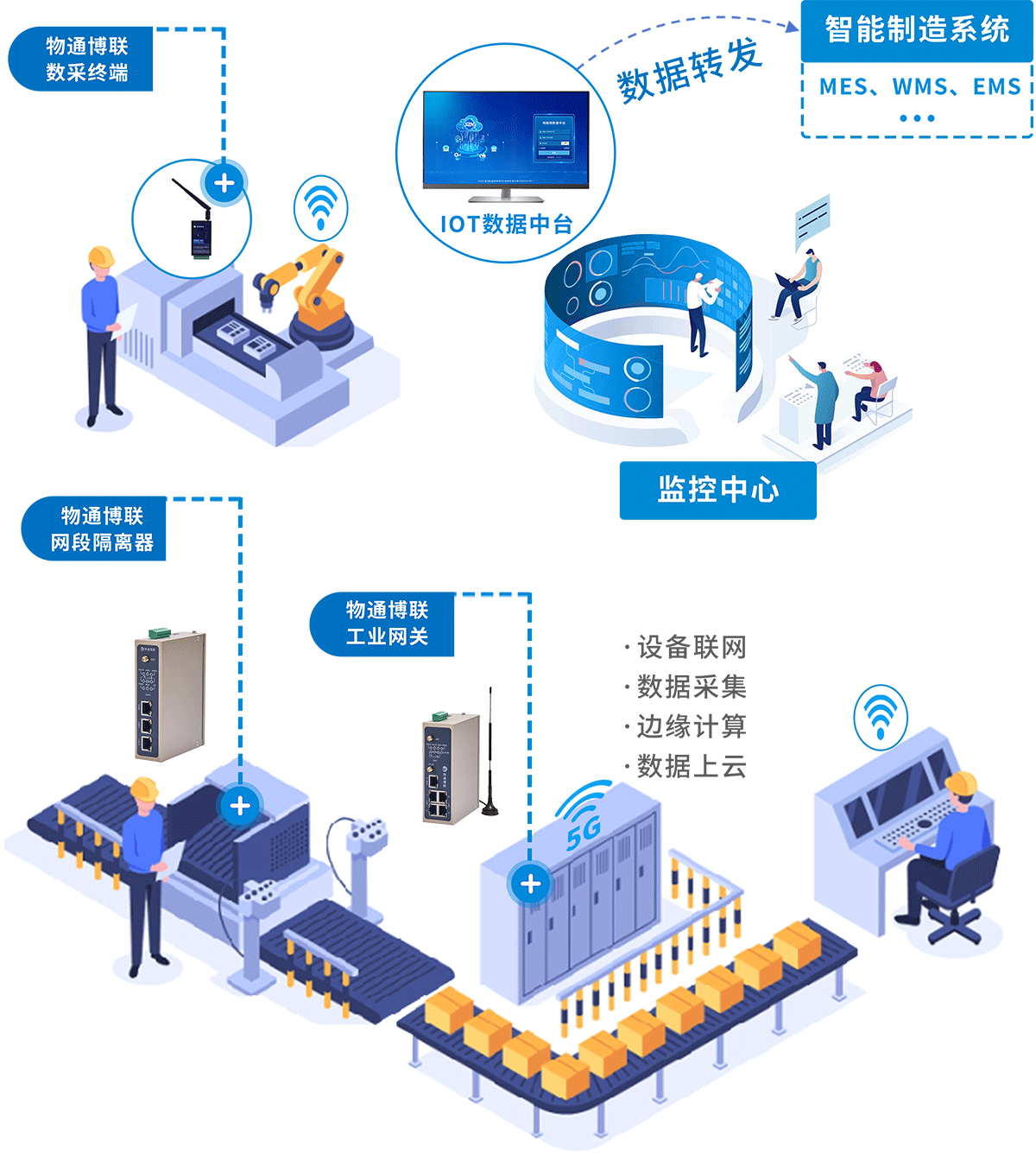 物通博聯圍繞工廠常見的產線物聯及數采,設備運營管理、能耗分析管控、生產安全監控及環保監控等方面,通過物聯網、大數據等先進技術的應用,為企業提供設備聯網、數據采集、數據標準化、數據監控、數據應用等一站式智能工廠數字化解決方案,提供工廠的數字化和智能化水平,推動制造企業轉型升級和可持續發展!