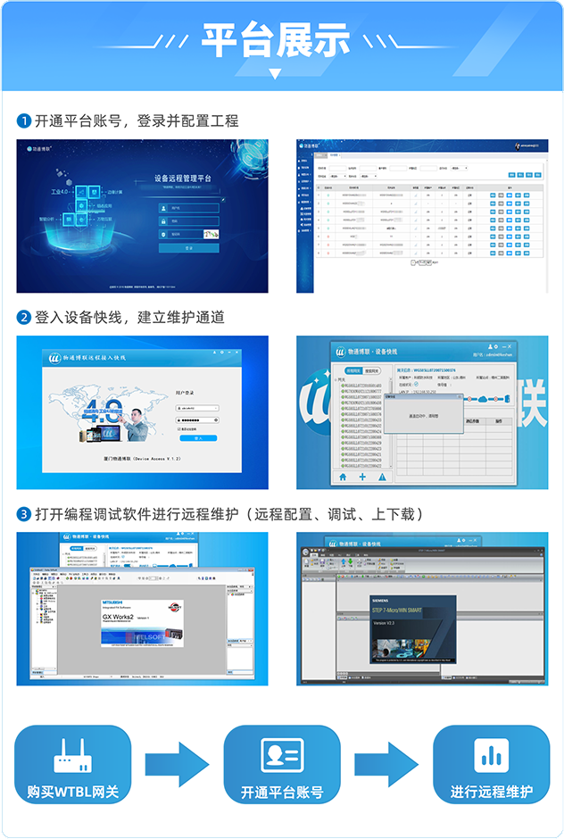 物通博聯設備遠程維護系統是專為分布式設備遠程維護而研發的一套系統,為工程師搭建一條通往遠端工業現場的安全數據通道,實現對現場設備的遠程維護、遠程診斷、遠程調試和遠程上下載程序,極大降低工程師出差成本、提高了工作效率、優化客戶服務和產品質量。