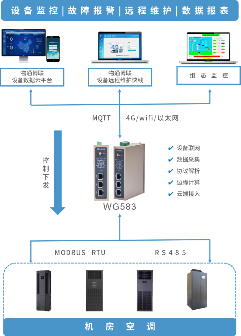 機房現場的恒溫加濕精密空調設備通過RS485串口連接到工業智能網關WG583,網關實時采集設備數據并通過4G/WIFI/以太網等方式上傳到IOT云平臺。通過IOT云平臺,用戶可以隨時查看設備運行狀態、技術參數、組態監控畫面并遠程控制設備啟停。當設備異常或者故障時,系統會自動報警,并將故障報警信息自動通過手機、郵件、微信等方式通知管理人員,管理人員能夠及時對設備進行遠程維護或者現場維護,實現機房空調的智能管理控制,從而保證現場環境溫濕度的恒定安全。