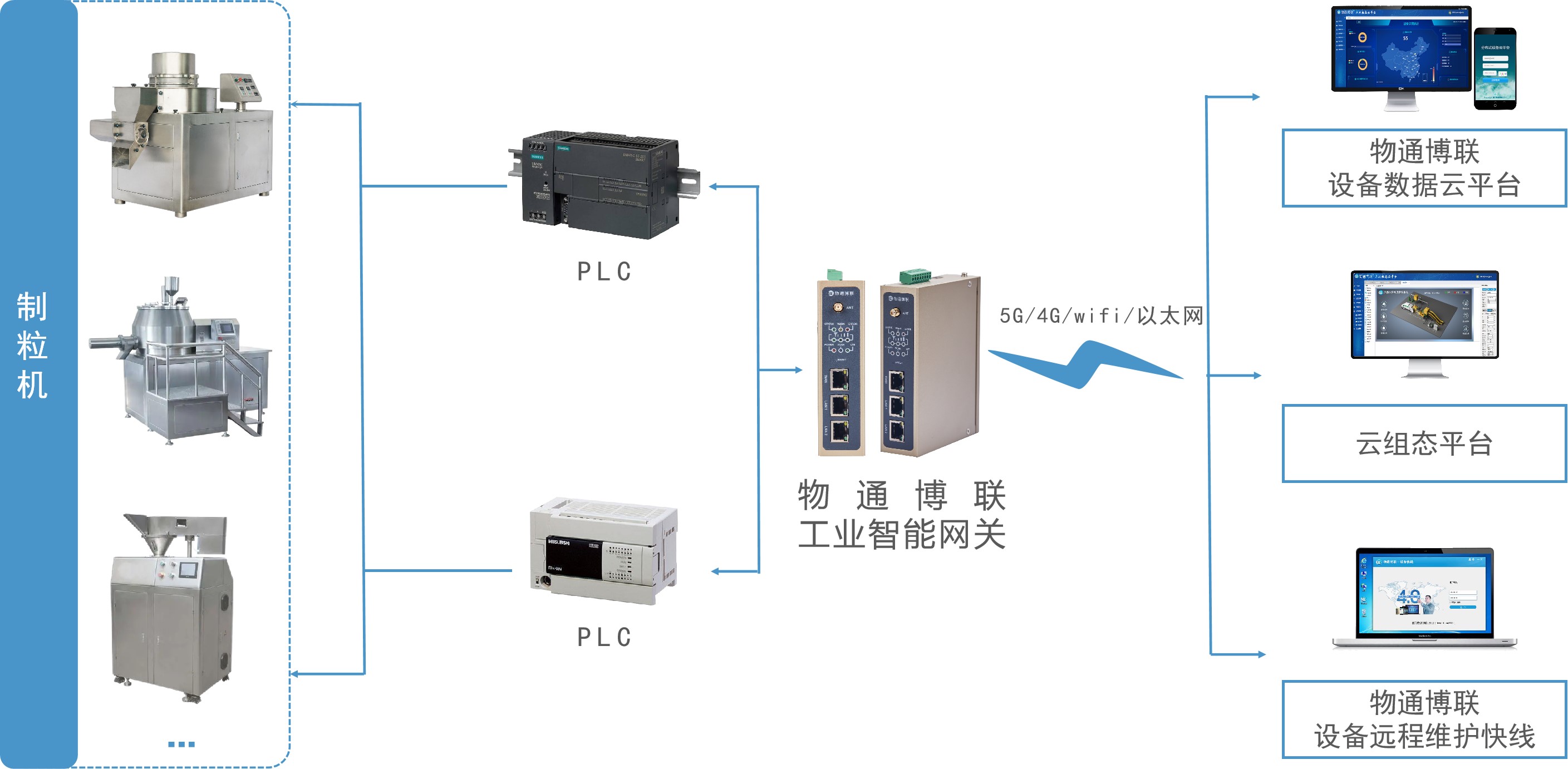 為保證藥品制粒過程的安全可靠,藥品質(zhì)量穩(wěn)定可控,同時出現(xiàn)故障得到及時解決,物通博聯(lián)提出基于PLC數(shù)據(jù)采集的制粒機遠程監(jiān)控和運維管理系統(tǒng),能夠滿足企業(yè)對藥品生產(chǎn)質(zhì)量控制的要求,實現(xiàn)制粒過程的精細化管理。