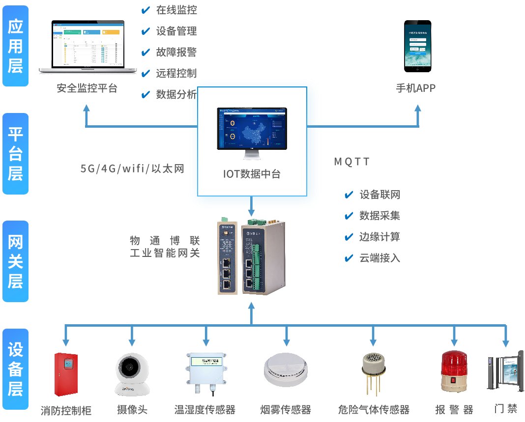 物通博聯推出的化工安全監控預警系統集成了物聯網技術、大數據分析、云計算等技術,實現對化工生產、倉儲、運輸全過程的實時監控和及時預警。通過將溫濕度傳感器、危險氣體傳感器、壓力計、PLC等設備接入到物通博聯工業智能網關中,實時采集設備參數并通過5G/4G網絡上傳到物通博聯IOT數據中臺,并將數據轉發給企業監控平臺或國家監管平臺。