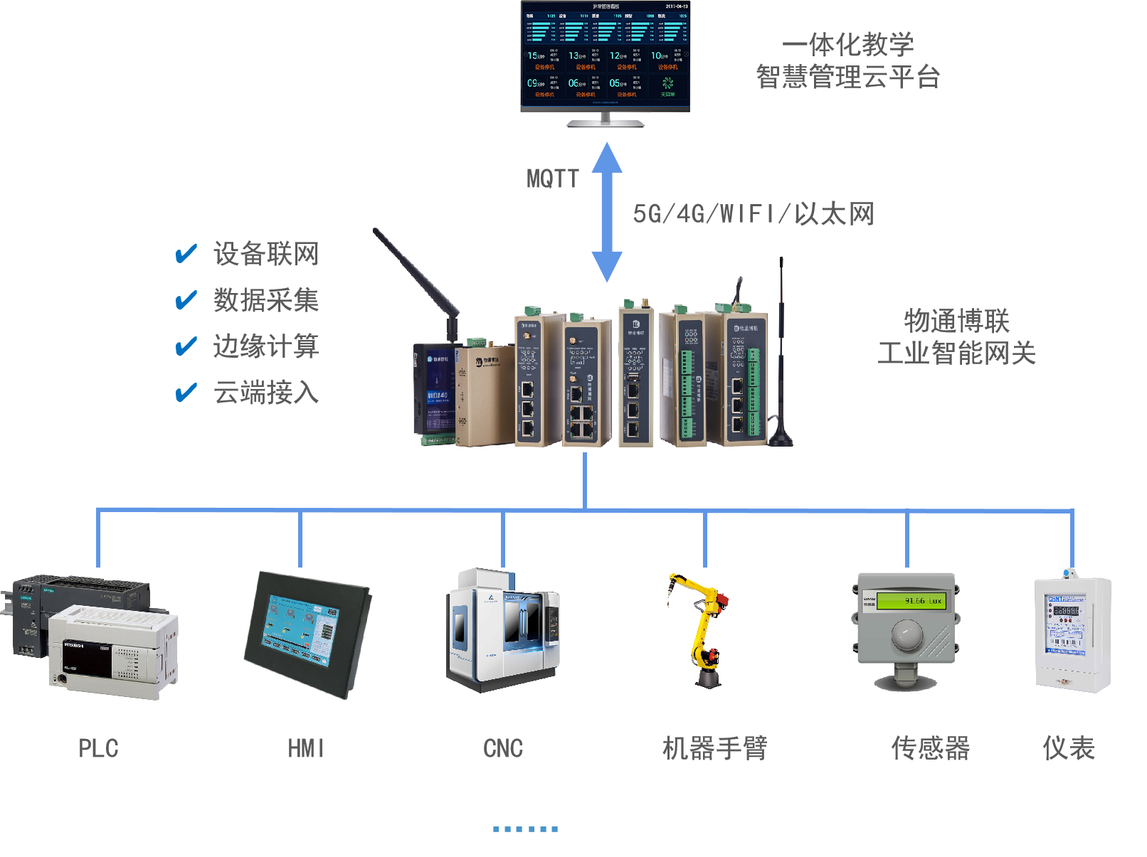 物通博聯WG系列工業智能網關是一款兩化融合和邊緣計算網關,具有豐富的物理接口,如RS232、RS485、以太網口、IO接口等,與實訓平臺的各種工業設備連接,解決接口不統一問題,內嵌豐富的工控協議和智能采集算法,實時采集設備數據,網關支持各種邊緣計算功能如智能采集、數據過濾、報警計算、跳變觸發、公式計算、分組策略、定時任務、算法開發等,通過對設備的模型建立和數據標準化后,將數據通過MQTT協議上傳到一體化教學智慧管理云平臺,幫助平臺實現各類工業設備數據的無縫接入、高效整合與精準應用,為提升實訓效果提供了強有力的技術支撐。