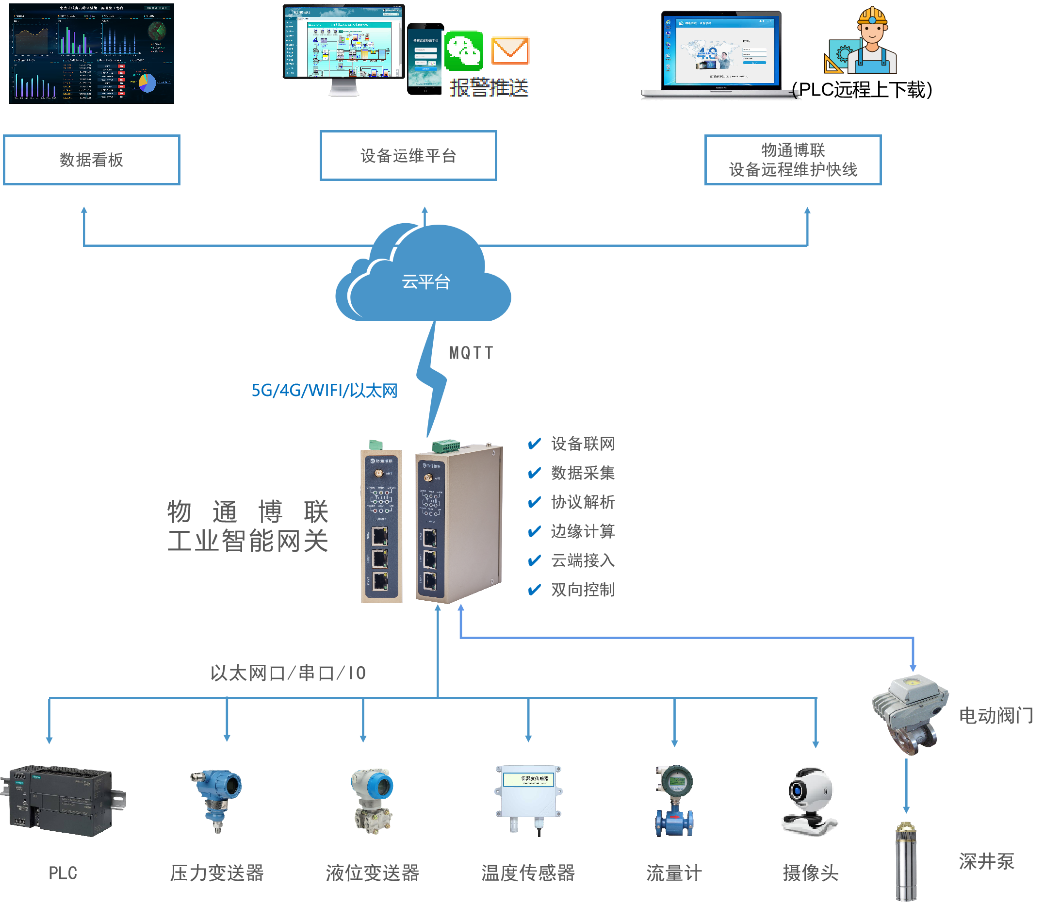 通過物通博聯(lián)工業(yè)智能網(wǎng)關(guān)采集解析現(xiàn)場(chǎng)泵站中的PLC、壓力變送器、溫度傳感器、液位變送器、流量計(jì)等設(shè)備運(yùn)行狀態(tài)和運(yùn)行數(shù)據(jù),再通過4G網(wǎng)絡(luò)將數(shù)據(jù)上傳到云平臺(tái)進(jìn)行遠(yuǎn)程監(jiān)控,平臺(tái)可視化展示泵站數(shù)據(jù)和運(yùn)行情況,管理運(yùn)維人員可以通過PC端平臺(tái)和手機(jī)端小程序隨時(shí)隨地監(jiān)控現(xiàn)場(chǎng)泵站情況,實(shí)現(xiàn)遠(yuǎn)程管理、故障報(bào)警、遠(yuǎn)程維護(hù)、數(shù)據(jù)分析等功能,同時(shí)云平臺(tái)支持下控網(wǎng)關(guān),可以對(duì)電動(dòng)閥門寫入開關(guān)值,實(shí)現(xiàn)遠(yuǎn)程啟停泵站設(shè)備,做到實(shí)時(shí)在線、無人值守,降低運(yùn)維人力成本。