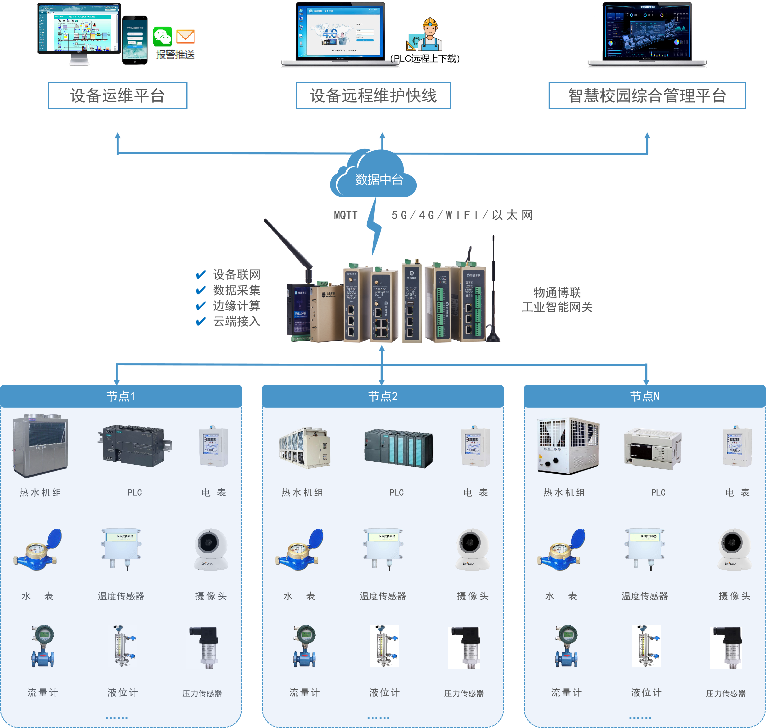 現(xiàn)場控制器PLC匯集溫度傳感器、液位傳感器、溢流開關、電磁閥、水表、空氣能設備、電表、變頻器、水泵、繼電器等設備,對這些設備進行邏輯控制,物通博聯(lián)工業(yè)智能網(wǎng)關通過以太網(wǎng)/串口方式從現(xiàn)場設備采集設備的各項數(shù)據(jù)(設備運行狀態(tài)、溫度、液位、出水壓力、耗電量、制熱量)等信息,利用邊緣計算能力對數(shù)據(jù)進行處理從而完成數(shù)據(jù)標準化,然后通過4G網(wǎng)絡把數(shù)據(jù)上傳物通博聯(lián)數(shù)據(jù)中臺,物通博聯(lián)數(shù)據(jù)中臺將數(shù)據(jù)轉(zhuǎn)發(fā)到設備遠程監(jiān)控管理系統(tǒng),實時監(jiān)控熱水機站狀態(tài),支持對熱水機組進行遠程控制,實現(xiàn)不同時段、不同天氣溫合理調(diào)節(jié)機站運行狀態(tài)、設置溫度,支持故障報警,告警異常及時通知到運維人員,提前發(fā)現(xiàn)及時處理,提升服務質(zhì)量,預防事故發(fā)生,降低運營成本,達到節(jié)能減排目的;同時物通博聯(lián)數(shù)據(jù)中臺將數(shù)據(jù)接入到智慧校園綜合管理平臺和校園一卡通系統(tǒng),方便學生和教職工使用,提高學校管理效率。