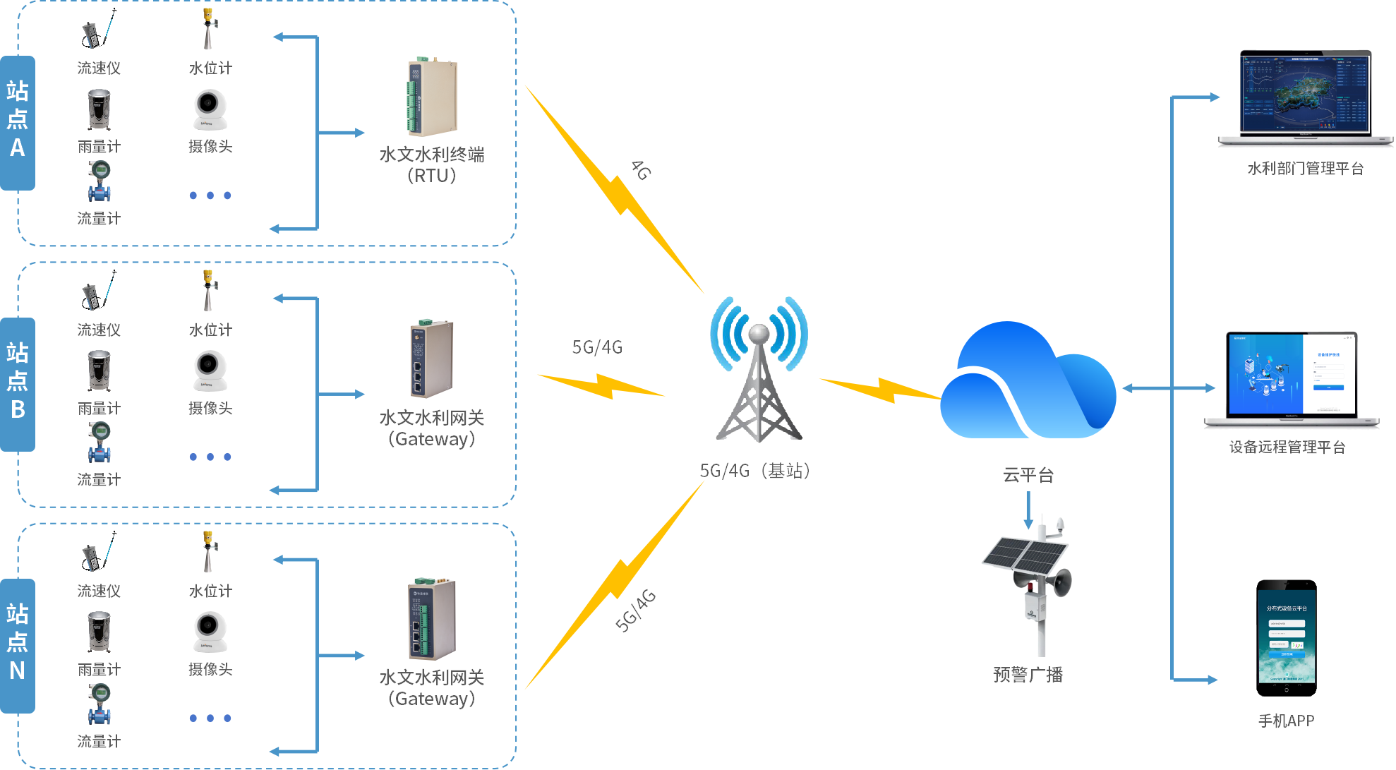 物通博聯提供中小流域防汛防洪監測預警系統解決方案。通過將水位計、流量計、雨量筒接入水利水文網關(RTU),實時采集水位、流量、雨量等數據并通過 4G/5G等多種通訊方式實現傳輸匯聚到各級中小河流治理信息化管理平臺,搭建起一張完整、精準、實時的水文監測網絡,提供準確有效的防洪防汛預報預警,便于形成預案應對、災害預演等數字化治理手段,加強中小流域防汛防洪治理水平與響應能力。