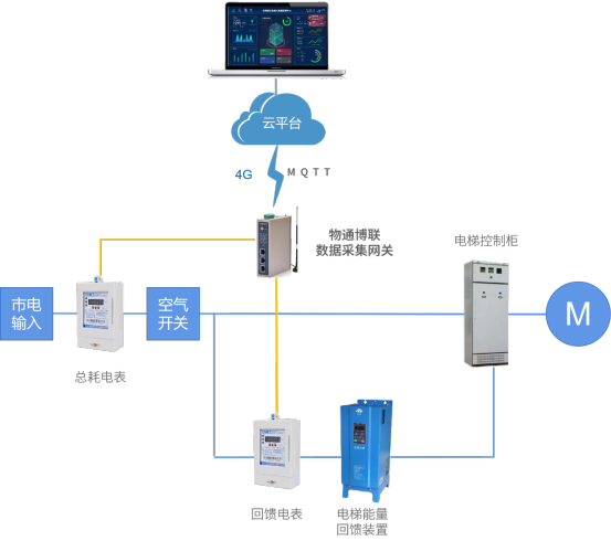 物通博聯樓宇電梯節能項目遠程監控系統,通過物通博聯數據采集網關與現場的電表連接(一般為2個電表,一個是在空氣開關前的市電輸入電表,采集電梯耗電量,一個是電梯能量回饋裝置出線位置的電表,采集電梯能量回饋裝置發電量),網關采集電表數據通過4G上網,發送到客戶自主監控平臺軟件,在平臺軟件上對數據進行分析計算,分析得出電梯的節電率和節能情況。