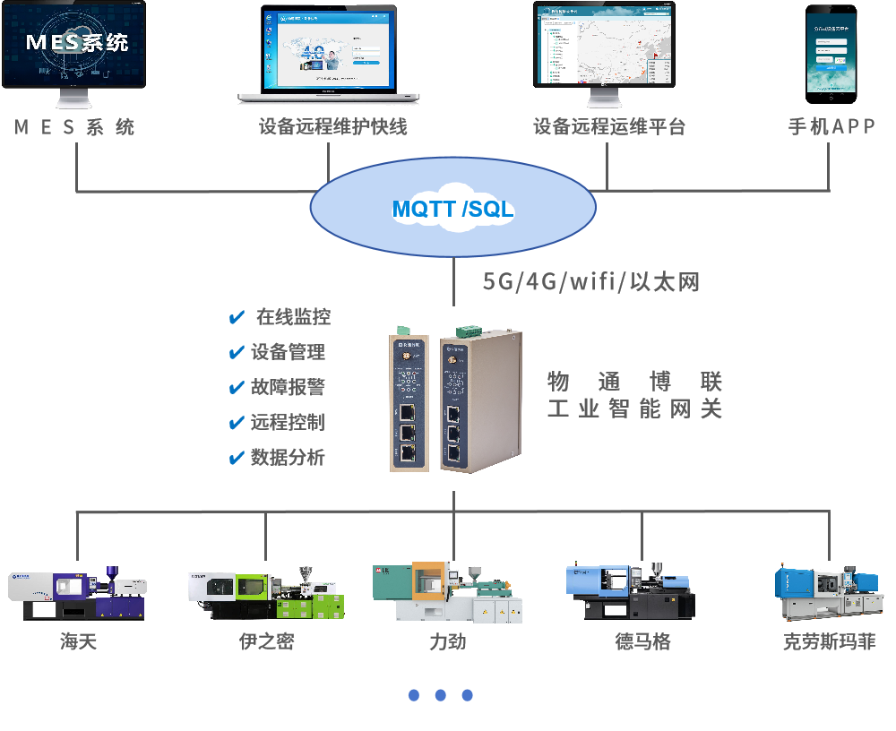 物通博聯(lián)推出的工業(yè)智能網(wǎng)關(guān)能夠接入弘訊、科強(qiáng)、恩格爾、住友、日精等注塑機(jī)控制器,從中采集注塑機(jī)運(yùn)行狀態(tài)、成型參數(shù)、工藝參數(shù)、報警信息等重要參數(shù),對接到工廠MES系統(tǒng)、ERP系統(tǒng)中,從而實(shí)現(xiàn)各項(xiàng)數(shù)據(jù)的統(tǒng)計展示與管理分析,輔助生產(chǎn)管理、工藝管理、運(yùn)維管理等工作高質(zhì)量開展,有助于提高工作效率與管理水平,企業(yè)效益持續(xù)增長。