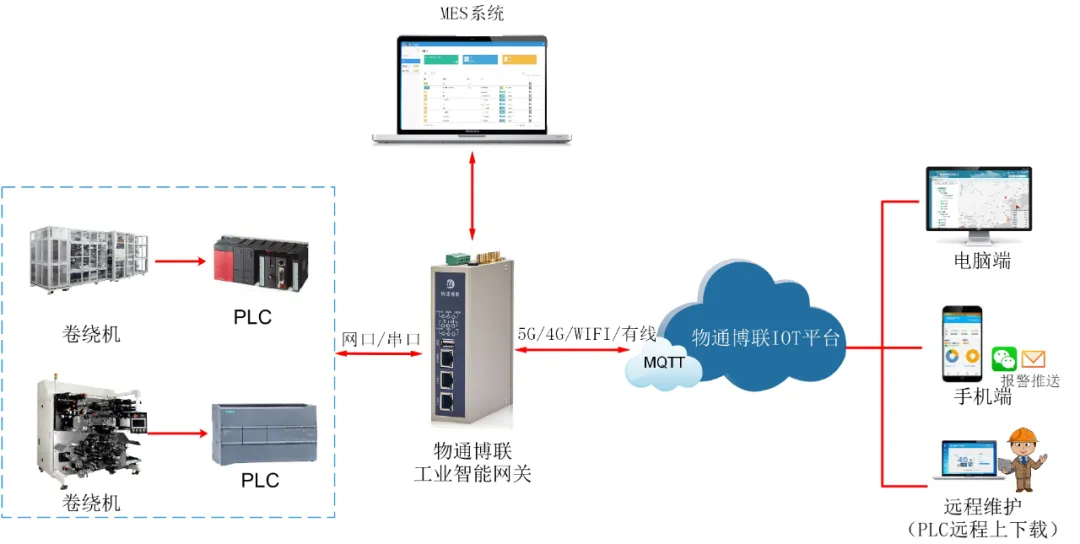 數(shù)據(jù)可對(duì)接到物通博聯(lián)IOT平臺(tái)、MES系統(tǒng)上,用戶可通過手機(jī)、電腦或車間大屏實(shí)時(shí)查看設(shè)備的各項(xiàng)參數(shù)和報(bào)警信息,方便企業(yè)對(duì)整個(gè)生產(chǎn)車間的設(shè)備進(jìn)行集中管理。