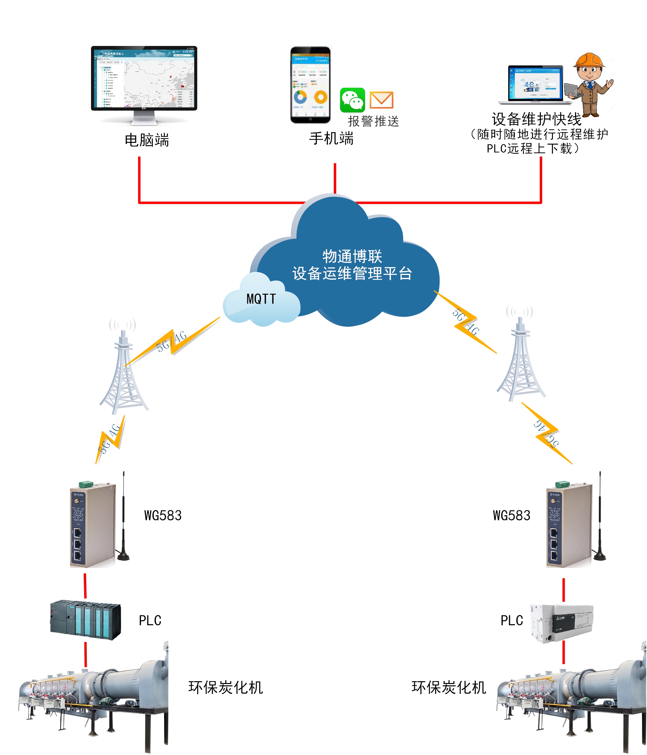 物通博聯工業智能網關通過接入炭化機PLC,能夠實時采集炭化爐溫度、煙氣溫度、煙氣流量、爐內壓力、風機狀態、冷卻水流量等數據,并通過5G/4G等網絡與企業設備運維管理平臺進行通信,從而實現設備遠程監控、故障告警、遠程控制、遠程維護、運維管理等功能,并借助數據分析手段不斷提高管理水平與工作效率,實現降本增效與高質量發展。